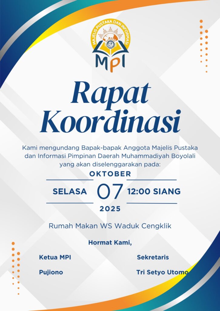 Boyolali, 7 Oktober 2025 — Majelis Pustaka dan Informasi (MPI) Pimpinan Daerah Muhammadiyah (PDM) Boyolali menggelar rapat penting menindaklanjuti surat undangan PDM Boyolali Nomor: 168/III.O/B/2023 tertanggal 30 September 2025 perihal Rapat Koordinasi Rencana Pelatihan Manajemen Reputasi Digital.
